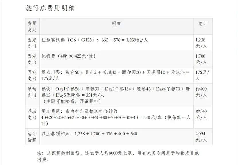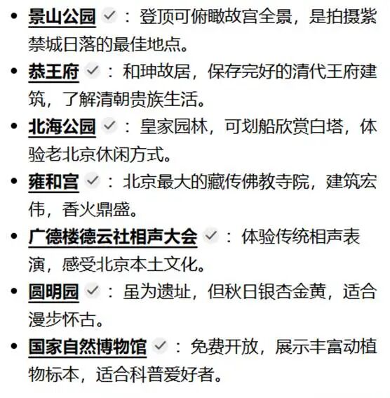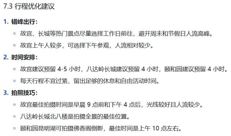 在景点安排上,故宫、长城、颐和园和圆明园等著名景点都有列入,信息覆盖全面,包括开放时间、门票价格、推荐项目及注意事项等。然而,部分景点的时间安排仍存在问题,例如,尽管颐和园的游玩时间建议为3小时,但行程中仅安排了2小时,而圆明园的游览时间则仅为20分钟,这引发了疑问。