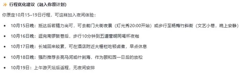 探索北京:AI助手的旅行推荐与比较在本次推荐中,Qwen指出了什刹海与亮马河国际风情水岸等多处颇具特色的去处。此外,天桥和国家大剧院的演出、簋街的夜宵以及胡同的夜骑等活动也被列入了推荐之中。