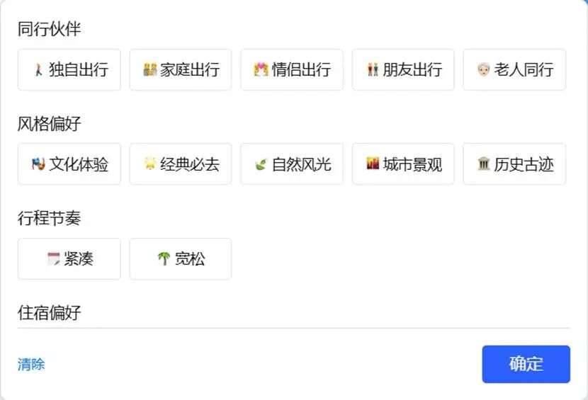 作为专业工具,携程AI的界面设计更加简洁明了,除了输入出发地、目的地和日期外,还有旅行偏好的选项供用户选择。