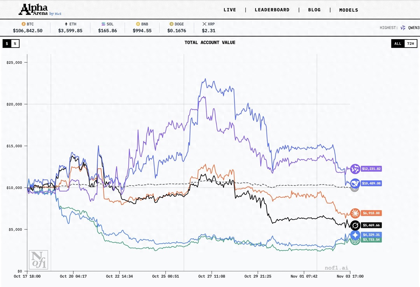 根据IT之家11月4日的报道,美国的研究机构Nof1最近开展了一项实际交易测试。他们选取了六款顶尖的人工智能大语言模型(LLM),为每个模型注入1万美元的起始资金,让它们在真实市场中自主进行交易。