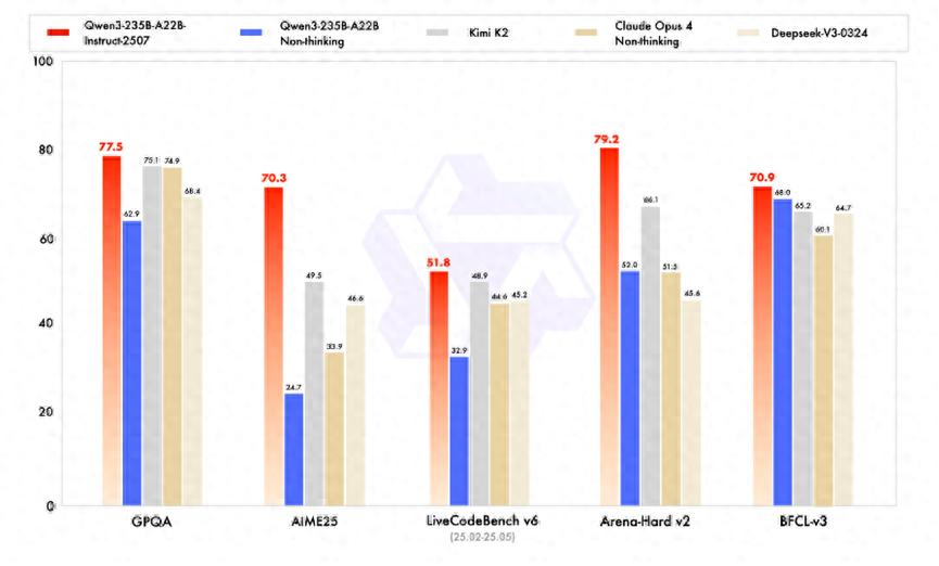 在指令遵循、逻辑推理、文本理解、数学、科学、编程及工具使用等多个维度,GQPA(知识)、AIME25(数学)、LiveCodeBench(编程)、Arena-Hard(人类偏好对齐)、BFCL(Agent能力)等测试中均表现优异,超越了Kimi-K2、DeepSeek-V3等顶尖开源模型以及Claude-Opus4-Non-thinking等领先闭源模型。