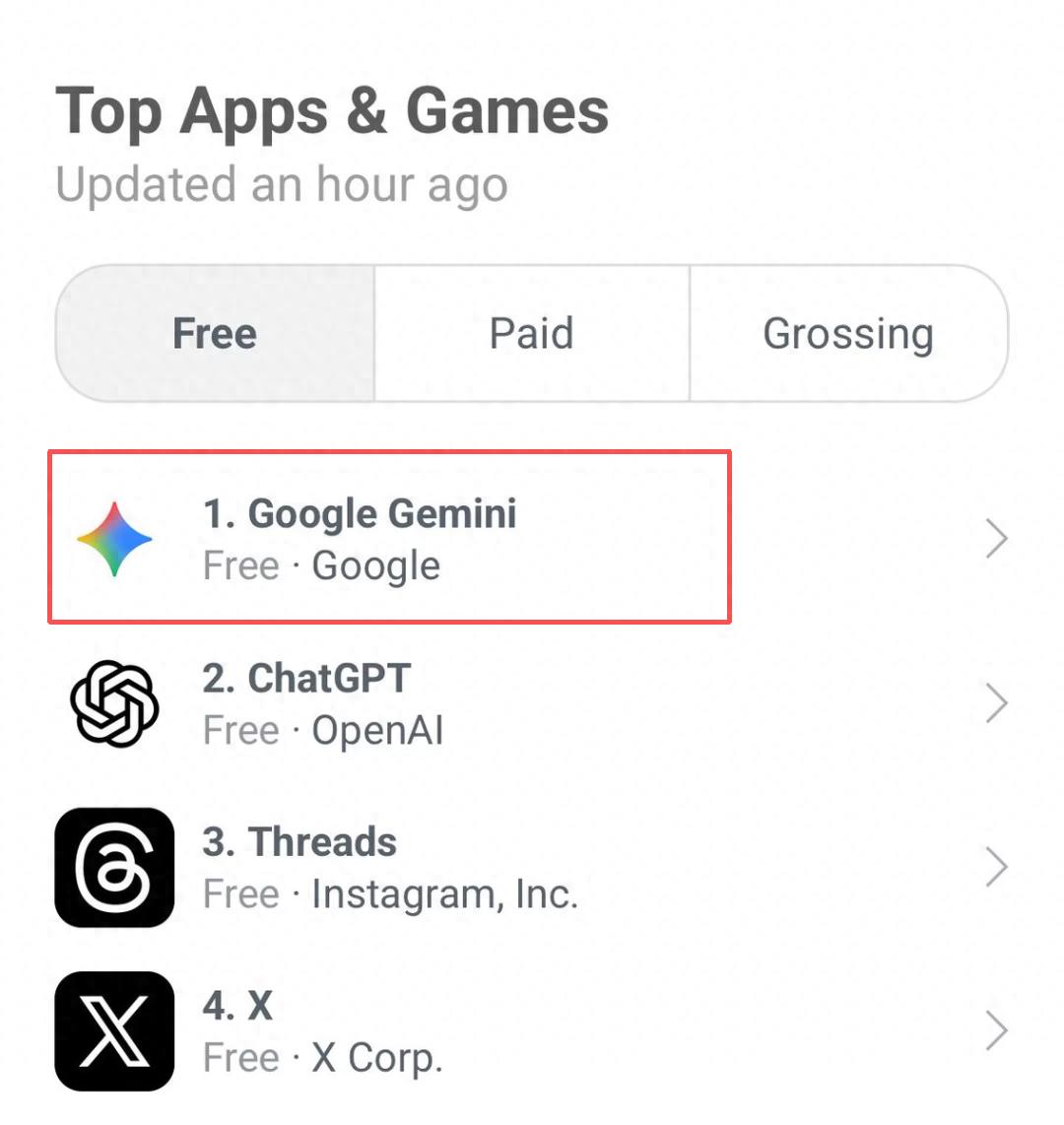 这种热潮还带动了Gemini App的用户激增,Nano Banana在短时间内为该应用吸引了超过1000万的新用户。更值得一提的是,Nano Banana的出现使得谷歌Gemini超越了长期占据苹果应用榜首的ChatGPT。