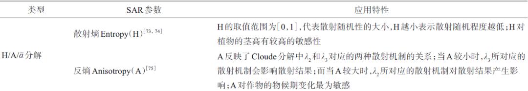 利用极化SAR数据提取的特征参数来反演农作物生长情况的研究已经取得了一定进展。例如,Canisius等研究了C波段RADARSAT-2全极化SAR数据与春小麦和油菜的物候特征之间的关系,结果表明,特征参数HV/HH、VH/VV和RVI与油菜株高显著相关,相关系数R2分别为0.83、0.81和0.86,同时VH/VV与春小麦的LAI也有显著相关,R2为0.77。Jiao等则探索了极化SAR参数与玉米及大豆LAI的关系,结果显示HV、LL及RR极化与玉米的LAI相关性极强,R2分别为0.96、0.95和0.95,而与大豆的相关性稍低,R2分别为0.86、0.86和0.83。基座高度与总功率也与玉米和大豆的LAI显著相关,相关系数分别为0.96与0.84,以及0.84与0.80。在全极化数据的极化分解方法中,常用的有相干分解和非相干分解。其中,非相干分解更接近自然界分布式目标的特性,因此在提取地物散射特征时应用广泛。由于农作物通常呈现非相干回波的特征,因此在反演农作物生长参数时,多采用非相干分解方法来获取特征参数。常见的非相干分解方法包括Freeman-Durden三分量分解、Cloude-Pottier分解及Yamaguchi四分量分解。目前,Cloude-Pottier分解方法和Freeman-Durden三分量分解方法在监测农作物生长方面应用较多。前述的H、A、α、SE、SERD、DERD、PH、PF、PA等特征参数,属于Cloude-Pottier的分解参数或扩展参数;而Odd、Dbl、Vol、Odd/Span、Vol/Odd、Vol/Span、Dbl/Span等特征参数则属于Freeman-Durden的分解参数或扩展参数。值得注意的是,H、A、α、Odd、Dbl、Vol、Odd/Span、Vol/Span等参数在反演生长参数时应用频繁。例如,针对LAI参数,Jiao等利用加拿大食品检验局的研究数据成功实现了对玉米和大豆LAI的反演,验证了H、α、Vol与LAI之间的相关性。关于株高参数,Canisius等以加拿大尼皮辛农业区为例,证实了α与油菜和小麦的株高相关性,R2分别为0.91和0.66。生物量参数反演的研究也较多,例如Zhang等在中国东北部内蒙古的研究发现,Vol与油菜生物量之间存在显著的相关性,决定系数为0.82。Wiseman等在加拿大马尼托巴省对油菜和玉米的干生物量进行了反演,结果表明H与干生物量的相关性,R2分别为0.81与0.84。而康伟等以内蒙古自治区上库力农场为例,实现了对小麦生物量的反演,验证了Odd、Vol、Odd/Span、Vol/Span、Vol/Odd与小麦生物量在对数模型下具有高相关性,相关系数R2分别为0.706、0.798、0.808、0.791和0.815。