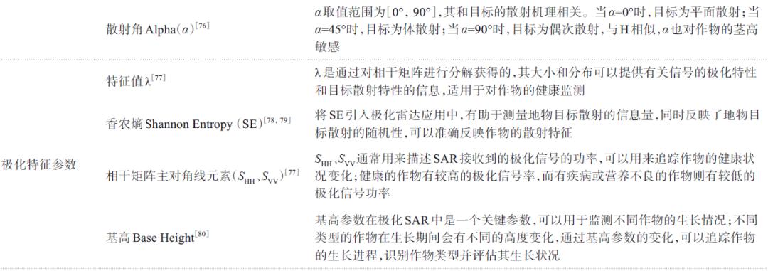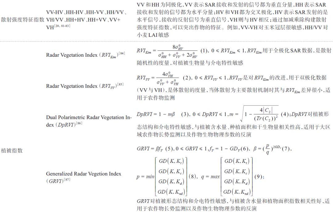SAR监测作物生长参数的基本原理依赖于SAR信号与植物之间的相互作用,并通过特定的散射模型及反演算法来推算作物的生长参数。SAR的工作波段主要在1到30厘米之间,涵盖了S、C、X、L和K波段,尤其是短波的C、X和L波段数据在作物长势监测中得到了广泛应用。当微波信号照射到植物时,部分信号会被植物的叶片吸收,而另一部分则被反射或散射。这种相互作用使得SAR的后向散射系数与作物的生长特征之间存在密切的关联。以LAI的监测为例,研究显示SAR后向散射系数与LAI呈正相关。LAI能够有效表征作物的叶片数量和垂直分布,通常情况下,高LAI区域由于密集的叶片分布,会产生更显著的微波反射,因此在SAR图像中表现出更高的后向散射强度。为了更加精准地进行此类监测,研究者们采用了多种与作物生长敏感的雷达参数来反演相关的生长参数。目前,常用的雷达遥感参数包括后向散射强度特征指数和雷达植被指数等。本文将对这些雷达遥感参数的类型及其应用特性进行总结,详见表2。
