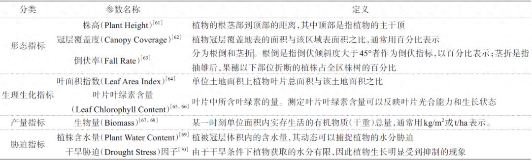 作物的生长监测不仅关注苗情,还要对生长状态及其变化进行全面、及时的评估。这一过程极其复杂,涉及到生理和生态的多重变化,因而需要通过一些特定的监测指标来量化生长特征。根据路贵和安海润的研究,农作物长势监测指标可分为多个类别,包括形态指标、生理生化指标、产量指标以及胁迫指标,具体情况见表1。其中,株高这一信息在传统光学或雷达遥感数据中获取的难度较大,而冠层覆盖度通常用于早期苗情的监控,倒伏率和干旱胁迫因子的参数则多针对特定灾害进行监测。相比之下,叶面积指数(LAI)和生物量被认为是最具代表性的常用长势参数。