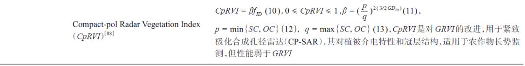 SAR监测作物生长参数的基本原理依赖于SAR信号与植物之间的相互作用,并通过特定的散射模型及反演算法来推算作物的生长参数。SAR的工作波段主要在1到30厘米之间,涵盖了S、C、X、L和K波段,尤其是短波的C、X和L波段数据在作物长势监测中得到了广泛应用。当微波信号照射到植物时,部分信号会被植物的叶片吸收,而另一部分则被反射或散射。这种相互作用使得SAR的后向散射系数与作物的生长特征之间存在密切的关联。以LAI的监测为例,研究显示SAR后向散射系数与LAI呈正相关。LAI能够有效表征作物的叶片数量和垂直分布,通常情况下,高LAI区域由于密集的叶片分布,会产生更显著的微波反射,因此在SAR图像中表现出更高的后向散射强度。为了更加精准地进行此类监测,研究者们采用了多种与作物生长敏感的雷达参数来反演相关的生长参数。目前,常用的雷达遥感参数包括后向散射强度特征指数和雷达植被指数等。本文将对这些雷达遥感参数的类型及其应用特性进行总结,详见表2。
