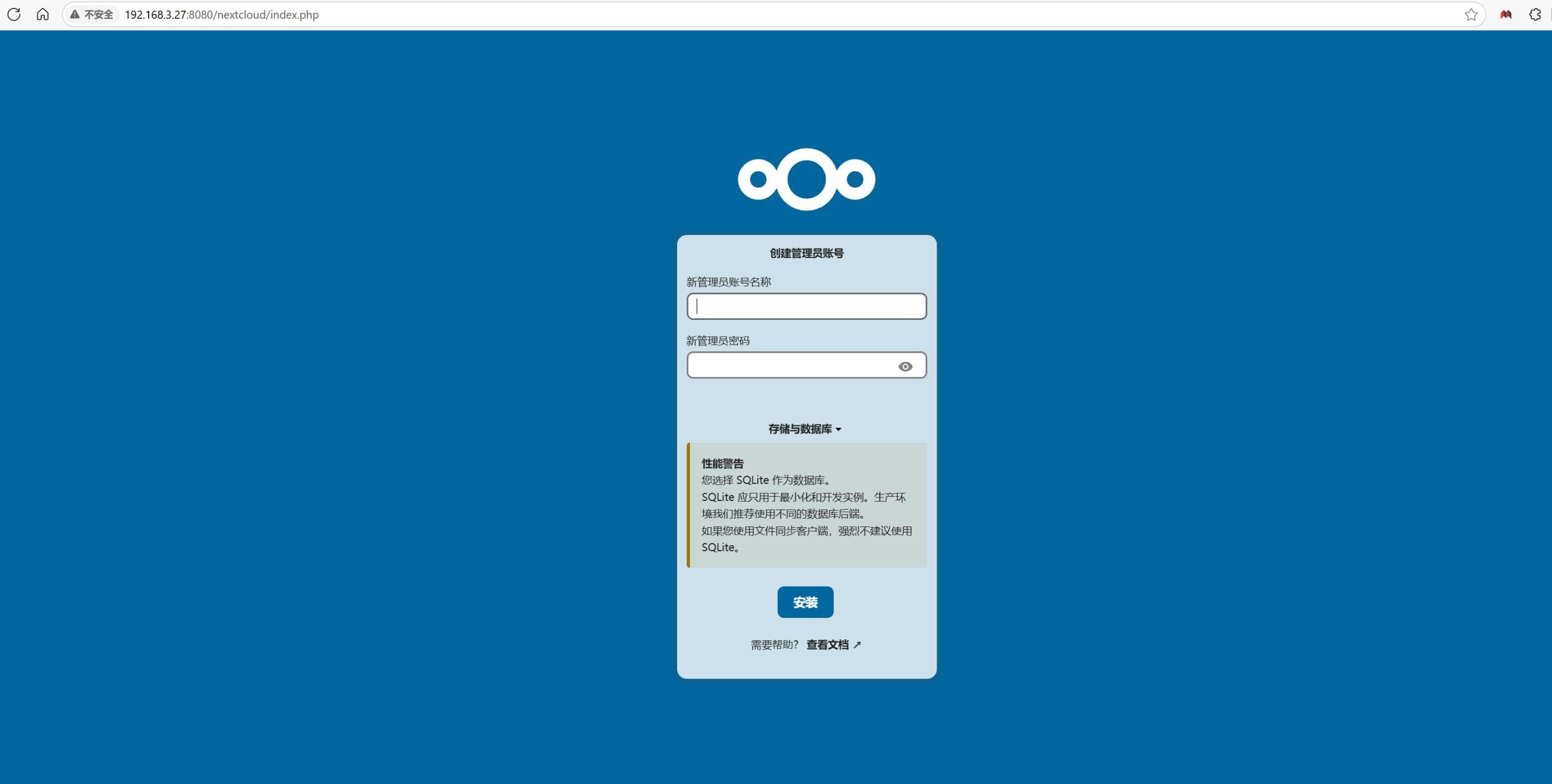 访问 Nextcloud 安装界面,网址为:http://ip:8080/nextcloud