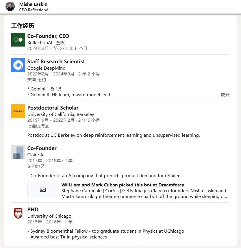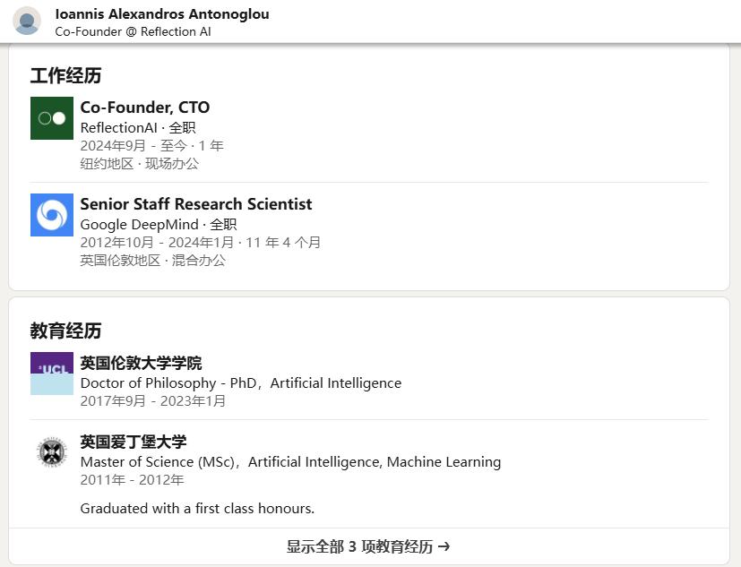 从团队构成来看,Reflection AI的两位创始人均为前谷歌DeepMind的杰出人才。