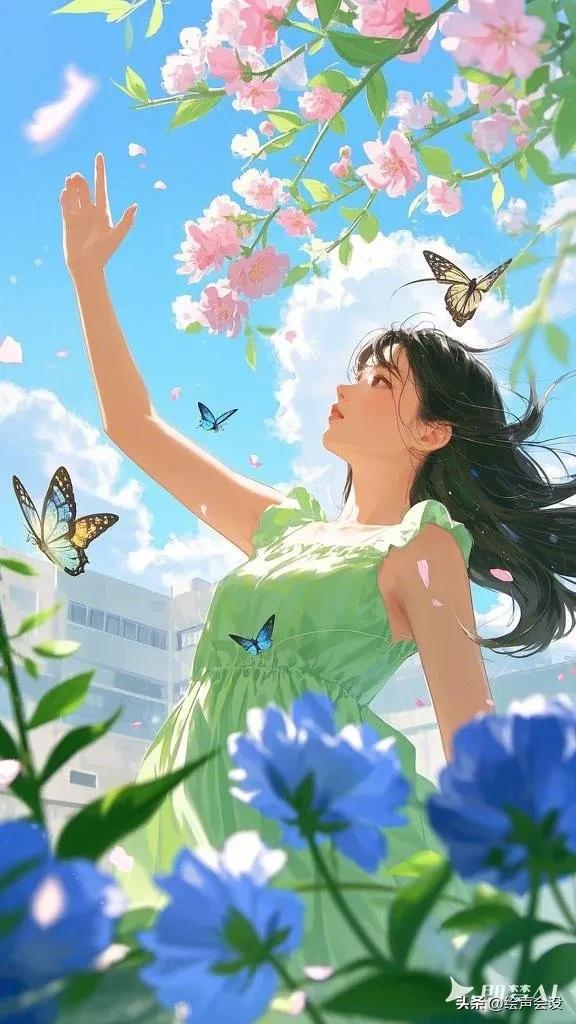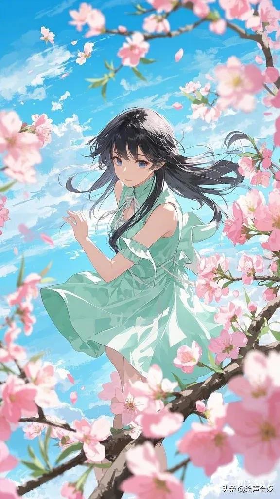 “一位身穿浅绿色连衣裙的女孩,黑色长发如瀑布般垂落,伫立在盛开的桃花树下,微风轻拂着她的发丝,背景为蓝天与白云,采用3D动漫风格,具有超高的分辨率,细节丰富。”
