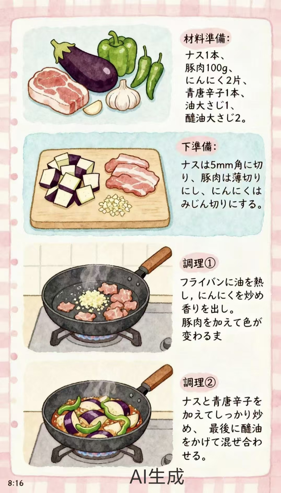 在中文和日文的识别能力上,Seedream 4.0的使用体验显著优于Nano-Banana。例如,一位日本用户使用该工具生成了一个茄子的手绘风格食谱图,画面细腻且可爱。
