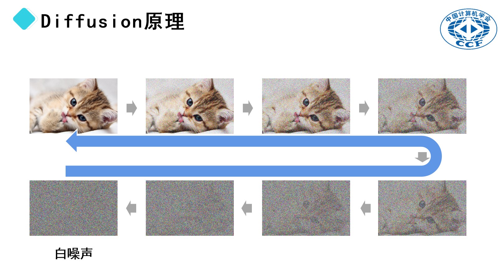 以一张小猫的图片为例。我们可以通过向这张图片中添加随机像素(噪声),使其变得模糊。当噪声增多时,图像的细节将逐步消失,最终呈现出一种类似于电视信号不良时的雪花状效果。这样的完全随机的像素分布被称为“白噪声”。