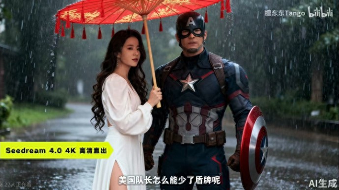 B站的创作者檀东东Tango尝试通过AI合成一幅图像,展现刘亦菲为美国队长遮雨的场景。经过比较,Seedream的表现明显优于Nano banana,特别是在衣物色彩的还原和场景细节的表现上,如雨滴在伞上的落下和盾牌上的细腻纹理都展现得淋漓尽致。