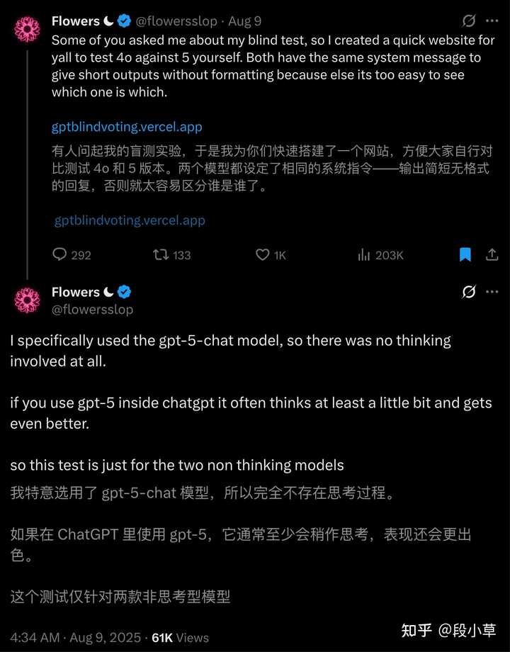 在X平台上的博主 Flowers ☾制作并发布了一个盲测网站,接入了gpt-5-chat和gpt-4o的API,免费供大家使用 https://gptblindvoting.vercel.app/: