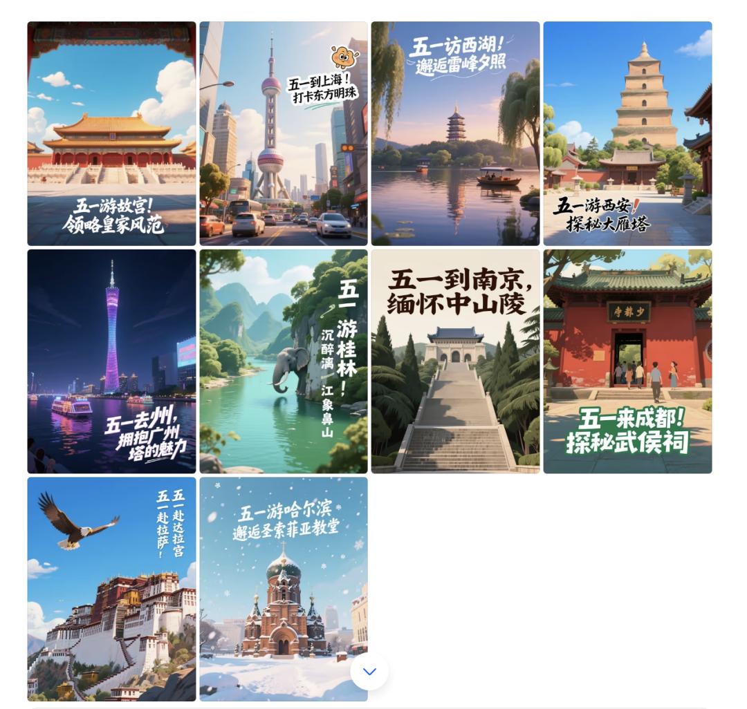 提示词:请生成10张国内著名景区的五一旅游海报,每张图中都要包含一个标志性建筑,海报上需附上相关文案,画面风格统一为动画电影,图片尺寸为3:4