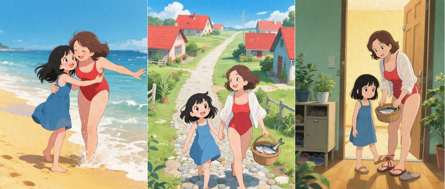 3. 多图生成时保持一致性。在需要批量生成的场景,如AI绘本或视频分镜等,不仅能保持风格的统一性,还能确保(基本的)角色一致性