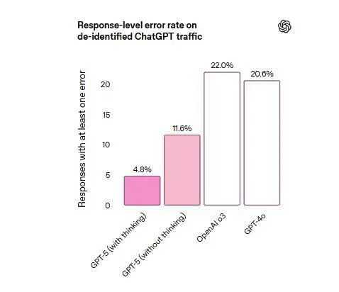 在启用网络搜索后,GPT-5在响应中出现事实错误的概率比GPT-4o低约45%;在经过思考后,GPT-5的响应中包含事实错误的概率比o3低约80%。如图所示,GPT-5的错误信息率仅为4.8%,而GPT-4o为20.6%,o3为22%。