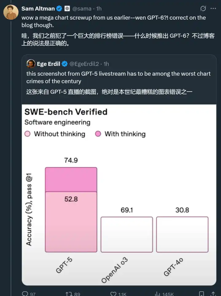 值得注意的是,在GPT-5发布会上,现场出现了一些技术问题,直播中展示的性能图表数据与实际不符。在编程基准测试(swe-bench)的图表中,GPT-5的准确率被标注为52.8%,而对应的柱状图却显示其高度超过了标注为69.1%的旧模型O3,激起了许多网友的质疑。奥特曼对此也承认了错误: