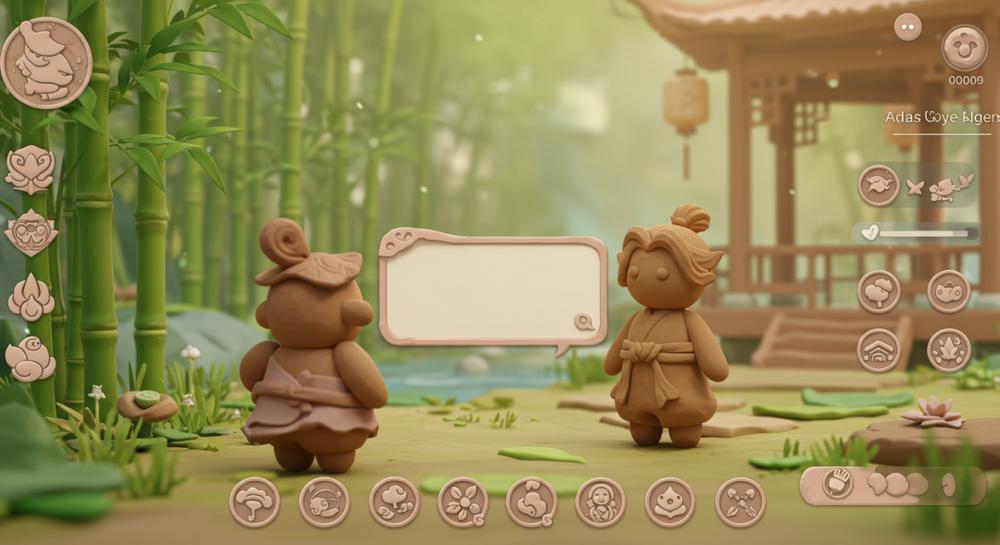 ## 改写内容 3D 粘土风格的横版 RPG 界面,正在与 NPC 交流,柔和的中式仙侠风,色调清新