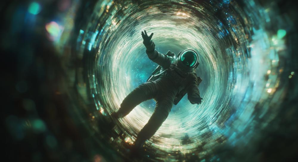 探索AI创作新境界:文生图提示框架的启示 一位孤独的宇航员漂浮在旋转的五光十色的宇宙漩涡中,四周被彩虹般的光线折射和液晶质感所环绕。像虫洞般的隧道扭曲了光线,展现出色差效果,营造出一个超现实且高维的环境。强烈的背光为宇航服勾勒出耀眼的亮点,同时投射出柔和的宇宙阴影。这一幕宛如一段电影般的星际旅行,唤起了孤独、美丽与未知的感觉。画面极为细致、真实,具有高对比度和体积光效,呈现出8K的电影级效果,采用Octane风格。