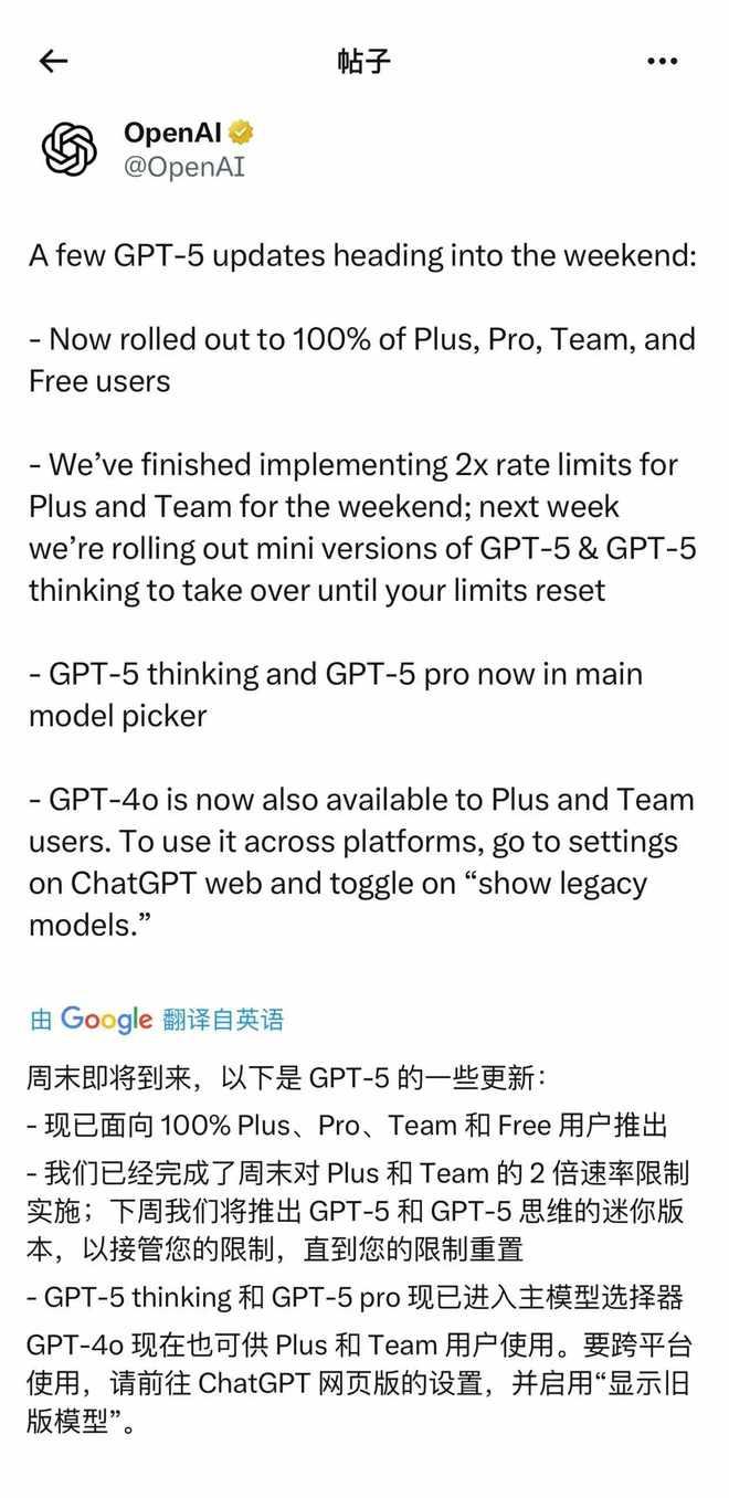 针对用户的争议,OpenAI发表声明,决定重新启用GPT-4o,供Plus和Team用户使用。若用户希望在多个平台上使用,可在ChatGPT网页版的设置中激活“显示旧版模型”来访问GPT-4o。同时,计划于下周推出迷你版GPT-5和GPT-5 thinking。
