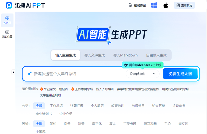 除了它,其实还有许多优秀的工具,我们也不必一味批评,应该取长补短。例如,对于打工人非常实用的PPT,我们可以使用迅捷AiPPT,只需给定主题,它就能迅速生成完整的PPT,且效果比我们亲自制作的还要精致,操作简单便捷。