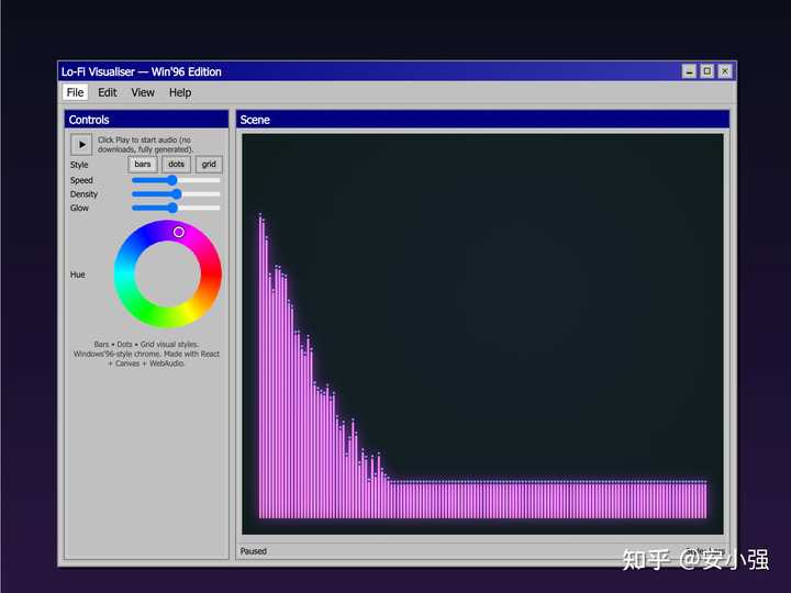 提供三种视觉风格(条形、点、网格),以及速度、密度和发光效果的调节滑块;