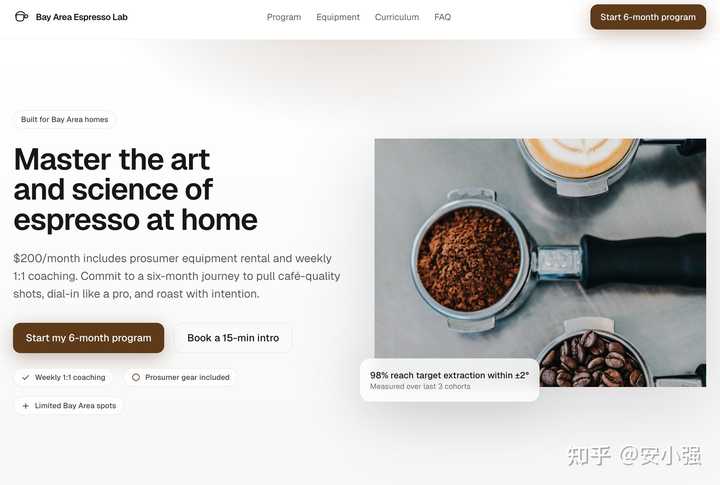 请生成一个美观、真实的Landing页面,服务于提供每月200美元的咖啡爱好者订阅服务,包含设备租赁和咖啡烘焙及制作终极浓缩咖啡的指导。