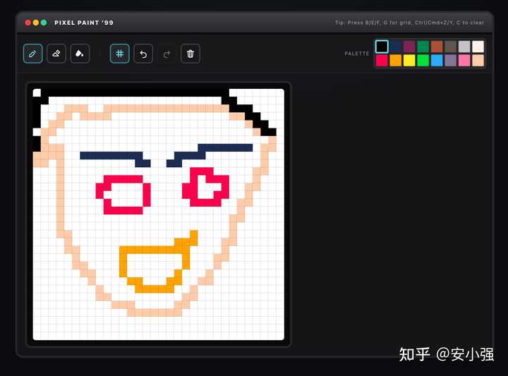 - 画布:固定的像素网格,支持缩放;提供铅笔、橡皮擦、填充、线条、矩形和圆形等工具;具备网格切换功能。