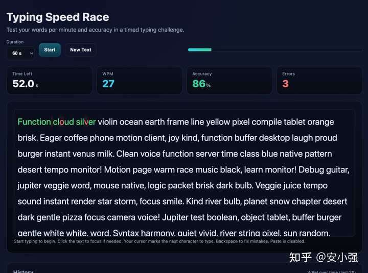 - 目标:在限时的打字挑战中测试每分钟字数(WPM)和准确率。