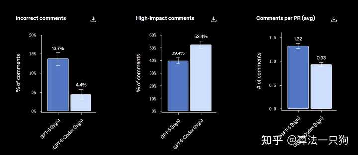 在代码审查性能的比较中(GPT-5与GPT-5-Codex),GPT-5-Codex特别强化了代码审查和缺陷识别的能力,能够浏览代码库、分析依赖关系、运行测试并验证正确性,输出更为可靠的评论。同时,其审查过程更为精准,干扰更少,使得用户可以集中精力于关键缺陷,从而提高代码质量和审查效率。