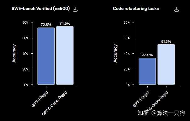 与GPT-5相比,新版本的Codex在SWE-bench上的表现提升了1.7个百分点,说明Codex版本在自动修复真实代码缺陷方面能力更强。而在代码重构任务中,GPT-5-Codex的准确率提高了17.4个百分点,相对性能几乎提升了50%。