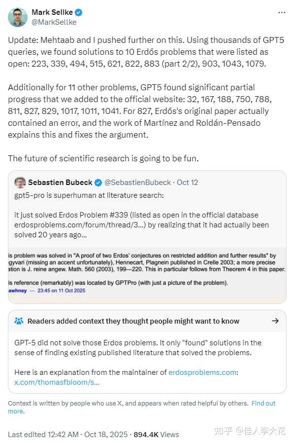 10月12日,Sebastien Bubeck在推特上发文称,GPT-5在文献搜索方面表现出色,发现了Erdős问题339已经得到解决,但其状态在官方数据库中仍未更新。