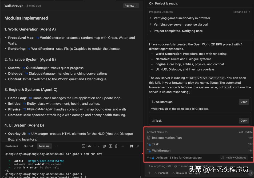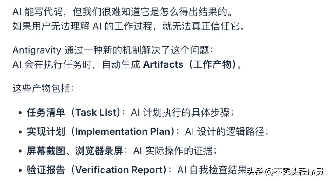2、文档机制:每个代理的输出不仅限于代码,还包括任务清单、执行计划、截屏以及浏览器录制,极大地提升了可追溯性和可信度。