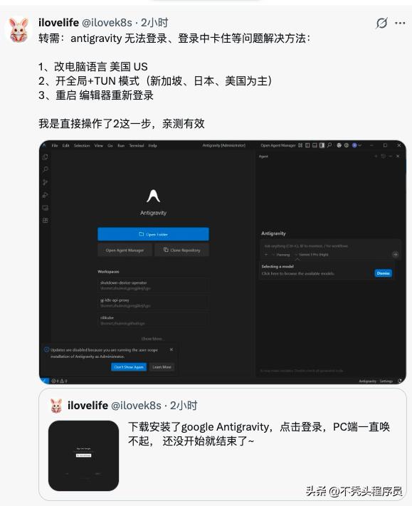 针对该问题,解决方案是关闭Antigravity的进程,然后选择全局 + TUN模式(建议使用美国节点),接着重启应用程序。