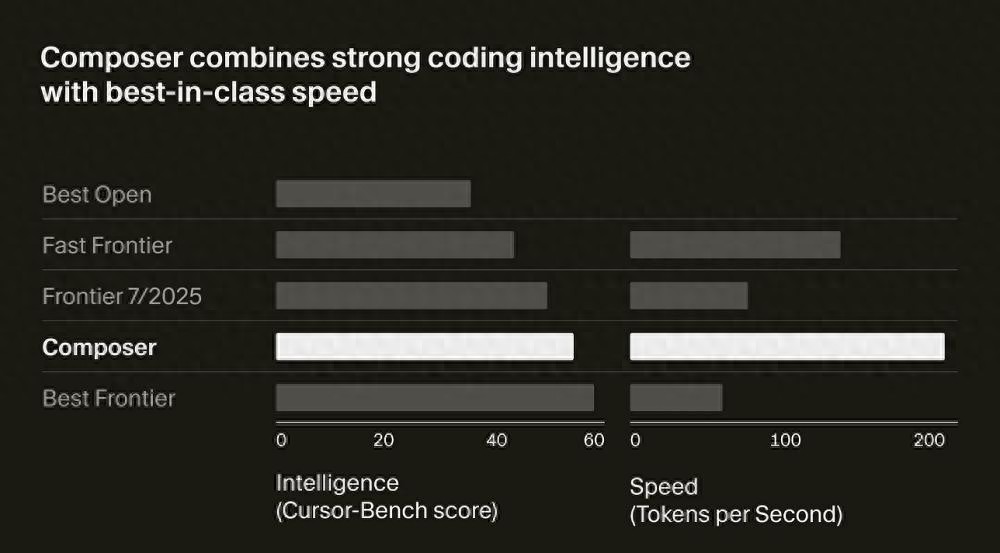在Cursor的内部测试中,Composer的智能表现已经超越了最优的开源编程模型(如Qwen Coder和GLM 4.6),并在速度上优于当前的轻量级前沿模型(包括Claude Haiku 4.5和Gemini Flash 2.5),但其智能水平仍然低于GPT-5和Claude Sonnet 4.5。