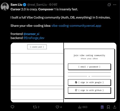 不少用户已分享了使用Composer的编程体验。开发者Sam Liu表示,Composer的速度非常快,他在短短五分钟内就创建了一个完整的Vide Coding社群,不仅实现了前端设计,连登录验证和后端数据库也一并完成。