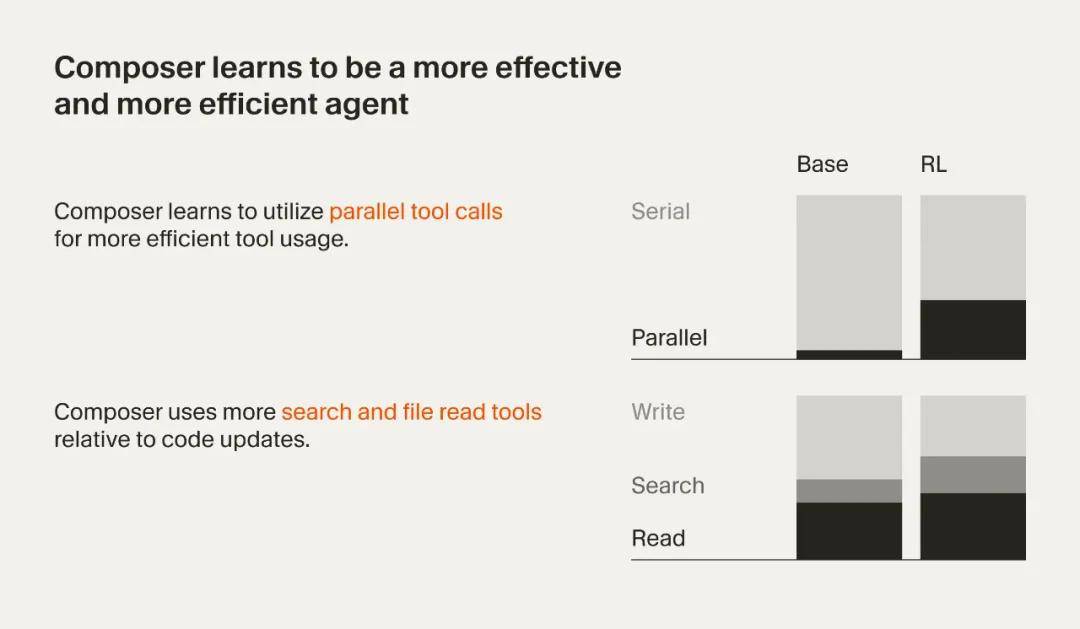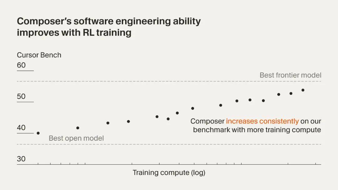 在架构方面,Composer 被设计为混合专家(MoE)模型,具备生成和理解长上下文的能力。它通过在多样化的开发环境中进行强化学习,针对软件工程进行了专门化的优化。在每次训练迭代中,模型都会接收到问题描述,并被要求生成最佳的响应,无论是代码的调整、方案的规划还是信息性的解答。模型不仅能利用文件的读取与编辑等基本工具,还能够调用更强大的功能,例如终端命令和全代码库的语义搜索。