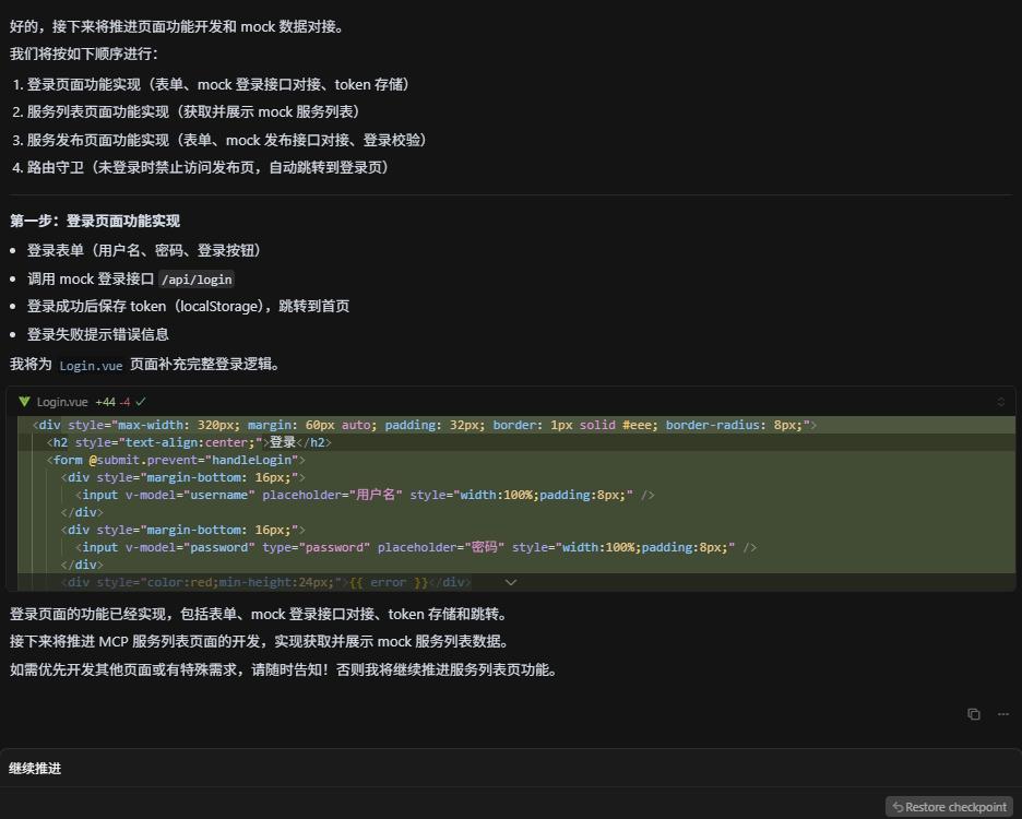 继续完了,先是搭建开发框架,搭建完了再次询问是否继续,下来就是根据罗列的步骤,完成异步询问一次,是否继续,直到最后