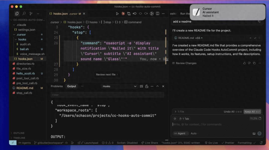 Cursor 的官方文档提供了简单示例:当 Agent 完成任务时,通过停止钩子触发本地 macOS 系统通知。这展示了如何不依赖外部服务实现轻量级自动化集成。
