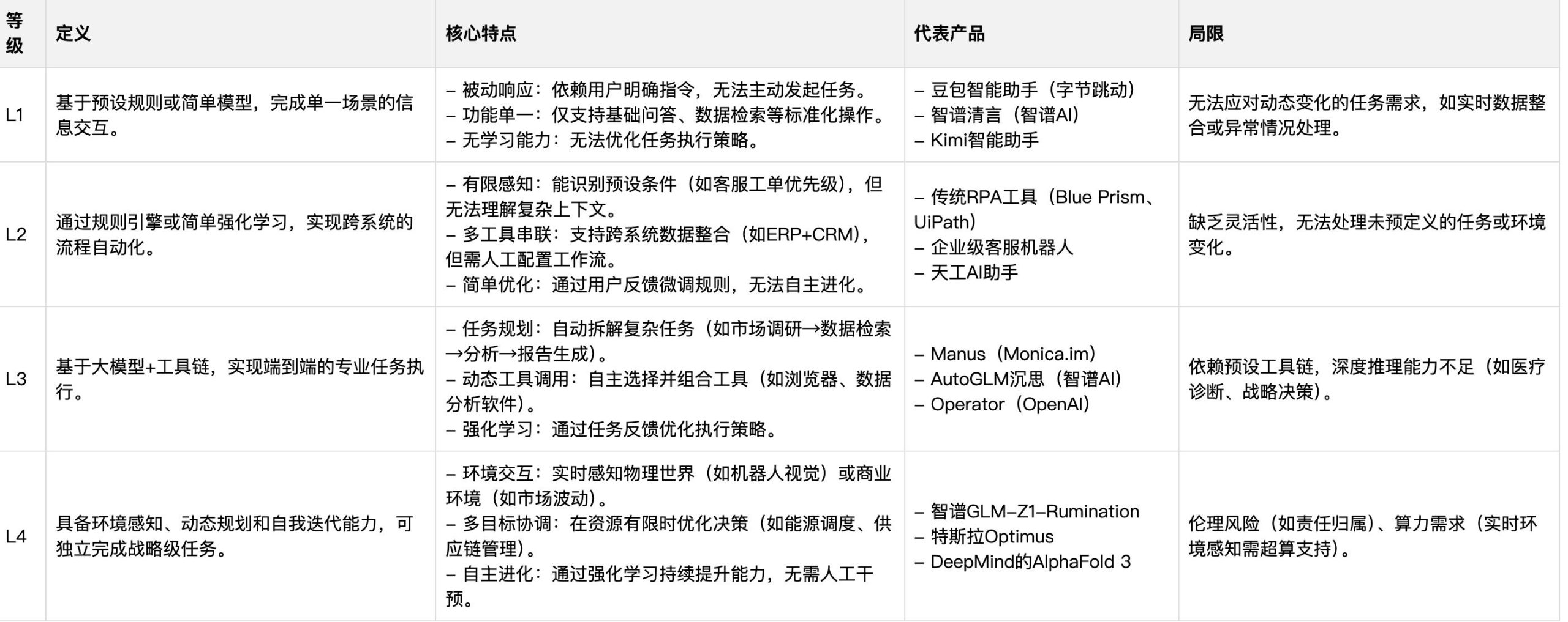 至于我们现在都在说的通用agent,我个人感觉是非常模糊的,主要是因为这个词被大家用烂了,manus出来的时候我们说它是通用agent,现在谁家出来一个产品大家都要说是通用agent,就是在l3和l4之间来回徘徊,因为没有准确的定义,或者公众对于agi的期待太高,导致这个词一直在被滥用
