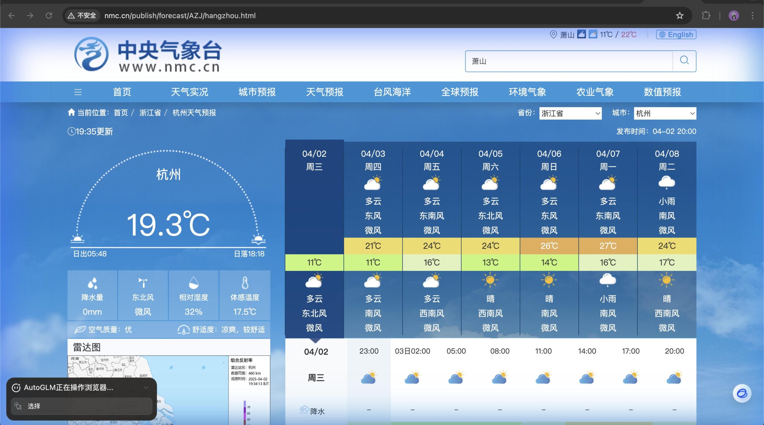 还不错,我以为他会打开一些商业天气网站,结果直接跳出来了中央气象台,还是很官方的
