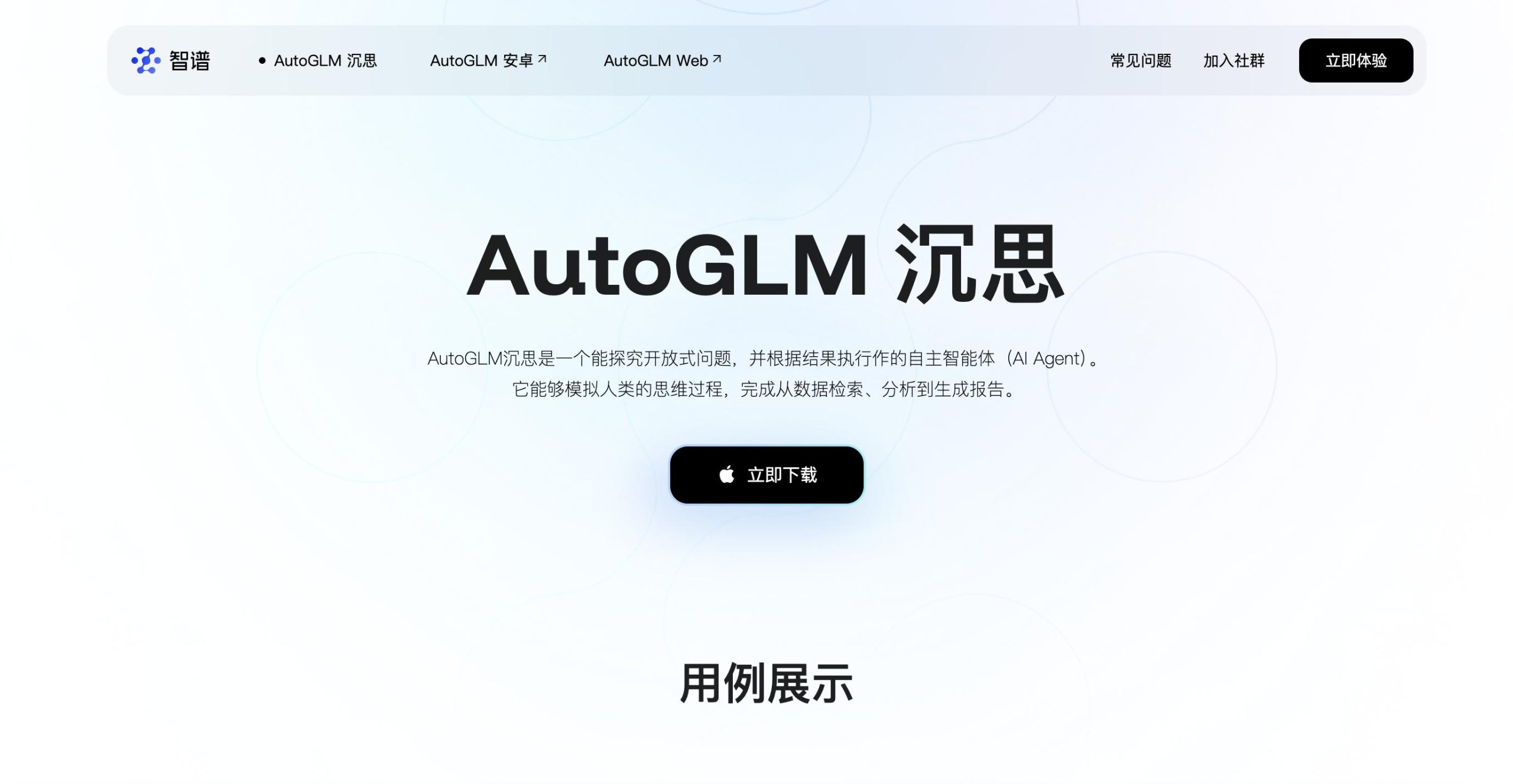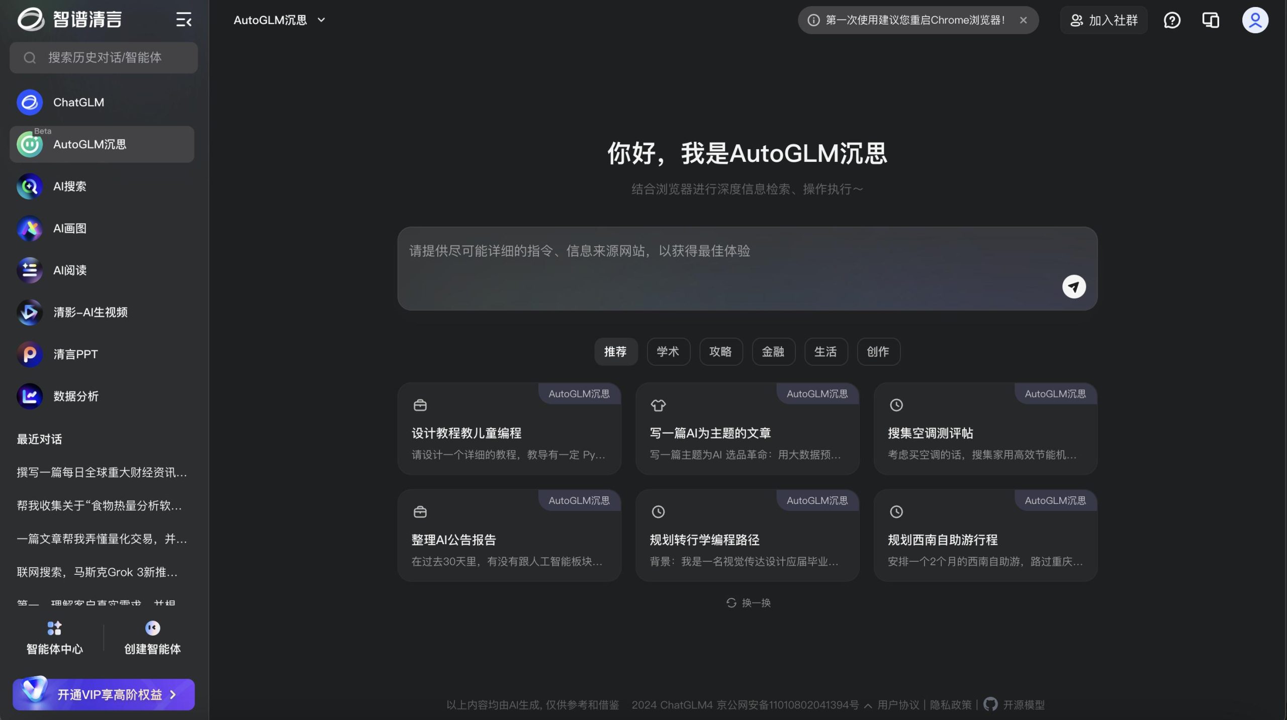 然后,这个时候你再打开智谱的时候,你就会神奇的发现,你的页面有一个新的功能,你可以点击旁边的沉思使用他们最新的研究功能,也可以点击autoglm沉思,体验他们的agent。
