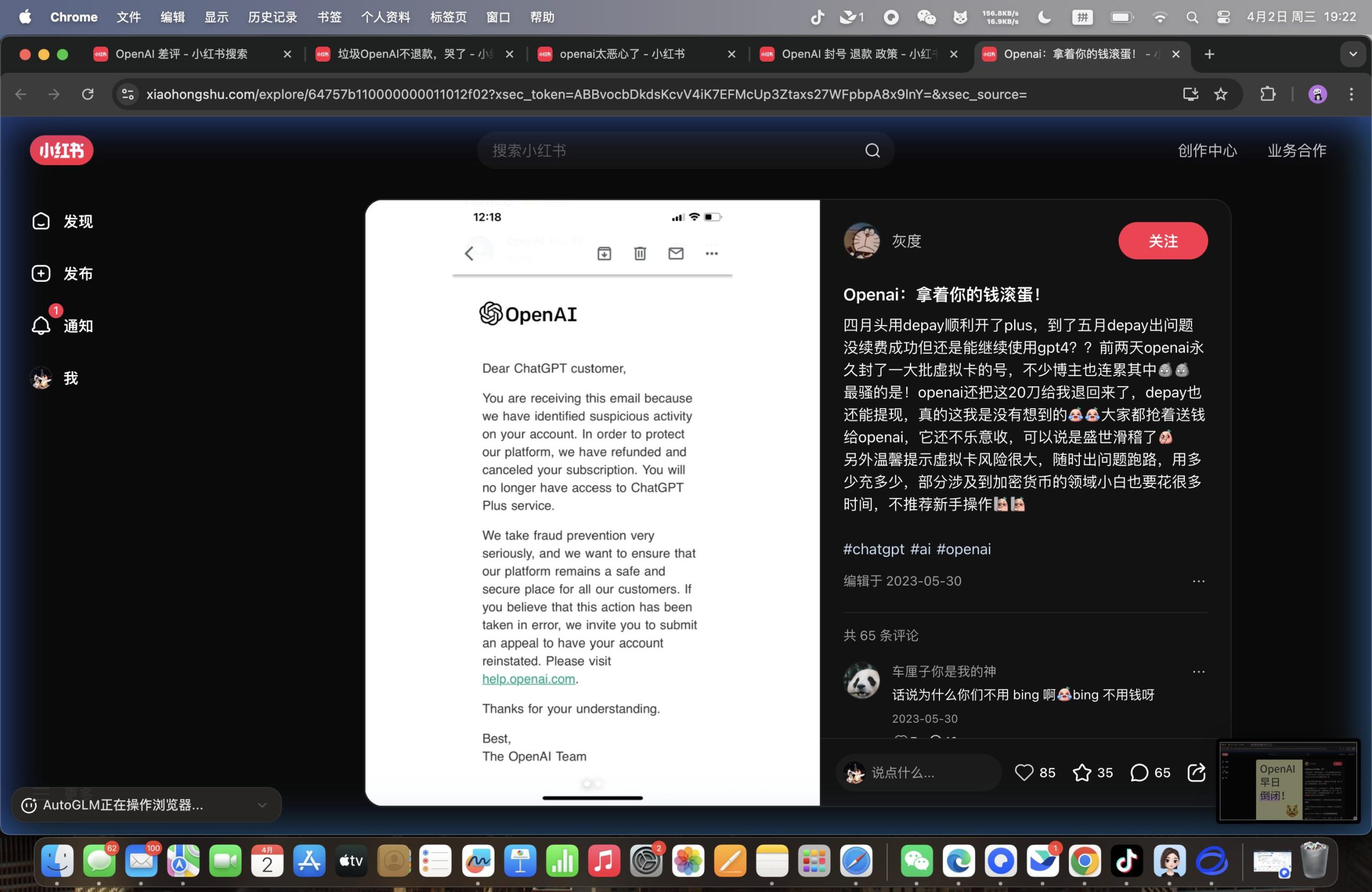 这里面,智谱autoglm一共进行了这几个步骤,先去分析问题,确定用户想要问的是什么,然后执行命令,打开小红书,请求登陆,阅读相关文章,然后判断哪一个情绪化最严重,再代入人物视角,进行回复
