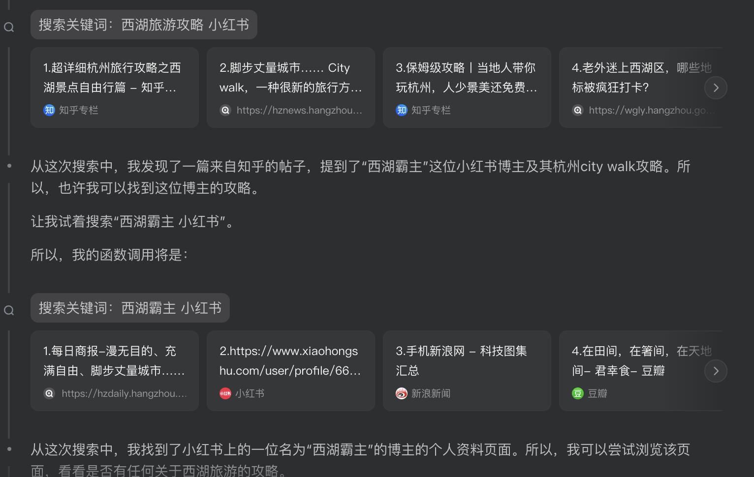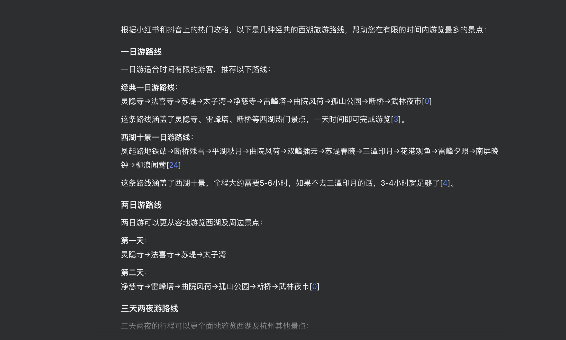 dangdangdangdang,一个智能版西湖旅游攻略就出来了,当然了我觉得还是不足的,包括吃什么,咋哪里吃,怎么规划时间路线和交通工具等等,不过这也是因为我没有具体的prompt,如果大家想要有更好的出行计划选择,就需要给出完整的信息,比如预算啊,出发地啊什么的,这样的效果会更好一些,而且从我使用体验来看,如果你想要选择酒店的时候,你也可以利用沉思功能,根据目的地选择便宜并且距离近的酒店,把它放在规划里面。(友情提示:图片里的一日游路线不要尝试,这完全是把人类当猴耍……)