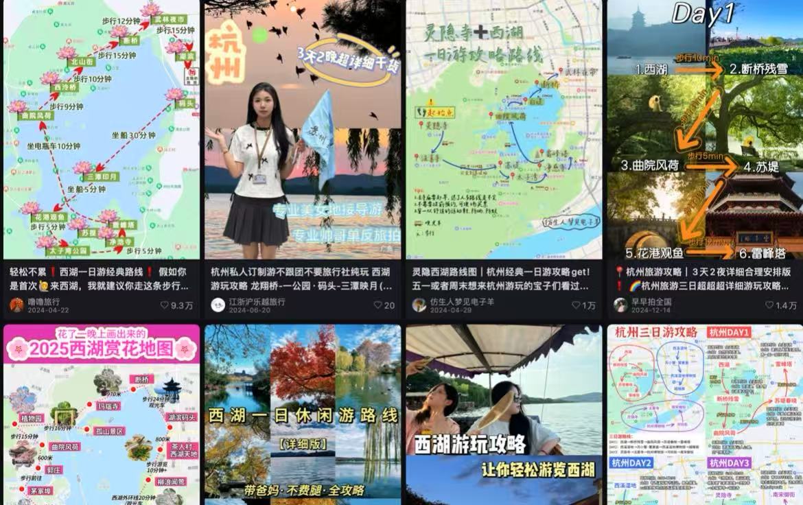 比如,你现在想去西湖旅游,但是你根本不知道旅行路线,传统方法你肯定要去各大平台去挨个搜取信息,比如去抖音看博主怎么玩的,去小红书看出行路线图,然后在这个过程中你还需要不断的翻用户评论,深怕自己踩坑了或者被宰了,最后你经过长达一个小时或者一天的时间,你终于规划出来一条自己认为还不错的旅行路线,但是你已经累趴了,就说你看到下面这种情况,你会不会窒息?反正我是直接b溃住了