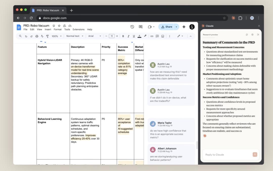此外,Claude在用户打开Google文档时,能够自动生成内容摘要,极大地方便了信息的获取。