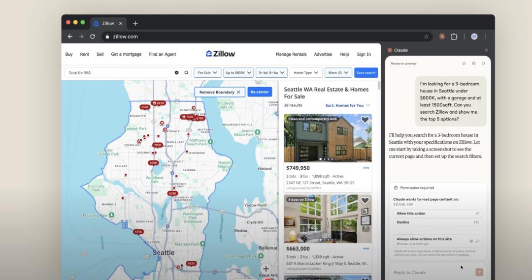例如,当用户输入:“我在西雅图寻找一套价格低于80万美元的三卧室房屋,需带车库且面积至少为1500平方英尺。你能通过Zillow进行搜索并展示前五个选项吗?”