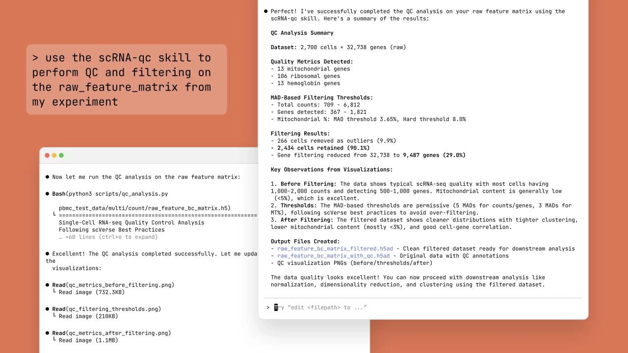 例如,Anthropic开发了一项名为“single-cell-rna-qc”的新技能,旨在自动化完成单细胞RNA测序数据的质量控制和筛选,从而显著提高研究的效率。