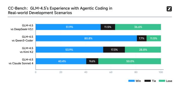 在GLM-4.5发布后的多项开源评测中,GLM-4.5与国际主流模型同样具备竞争力,其中在WebDev Arena中与全球领先模型并列第二,而在SWE-bench Verified性能方面超越了Gemini-2.5-Pro和GPT-4.1。在CC-bench的评测中,智谱与DeepSeek、Kimi K2模型互有胜负,而对Qwen-Coder则占据了明显优势。