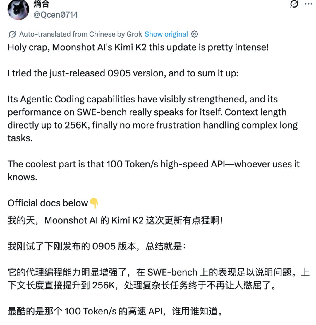 有关最新的 Kimi-K2-0905,有人表示:“终于可以摆脱处理复杂长任务带来的挫折感了。”